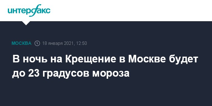 Москва. 18 января. INTERFAX.RU - В ночь на Крещение в Москве и области ожидается до 23 градусов мороза, возможен небольшой снег, следует из данных прогноза погоды, опубликованных на сайте Гидрометцентра РФ в понедельник.