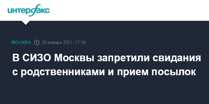 Москва. 20 января. INTERFAX.RU - Столичное управление Федеральной службы исполнения наказаний (ФСИН) сообщило, что в связи с пандемией коронавируса в следственных изоляторах Москвы введены ограничительные меры, в том числе прекращены свидания заключенных с родственниками и прием посылок для них.