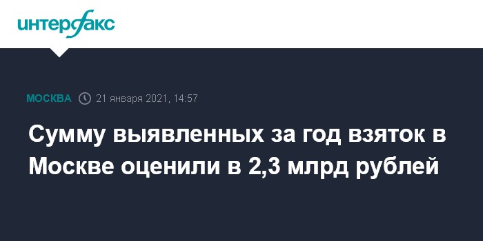 Москва. 21 января. INTERFAX.RU - Сотрудники правоохранительных органов зарегистрировали более 11 тыс. экономических преступлений за 12 месяцев 2020 года в столице, сумма выявленных взяток составила 2,3 млрд рублей.