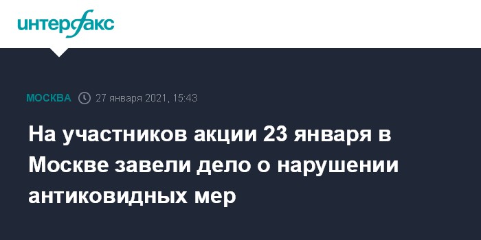 Москва. 27 января. INTERFAX.RU - В МВД России сообщили о возбуждении уголовного дела о нарушении санитарно-эпидемиологических правил в отношении участников прошедших в Москве 23 января несанкционированных акций.