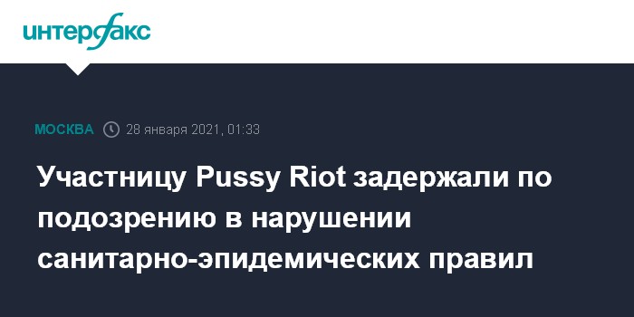 Москва. 28 января. INTERFAX.RU - Полиция задержала участницу группы Pussy Riot Марию Алехину по подозрению в нарушении санитарно-эпидемического режима на акции 23 января, сообщил "Интерфаксу" в четверг ее адвокат Геннадий Федоров.