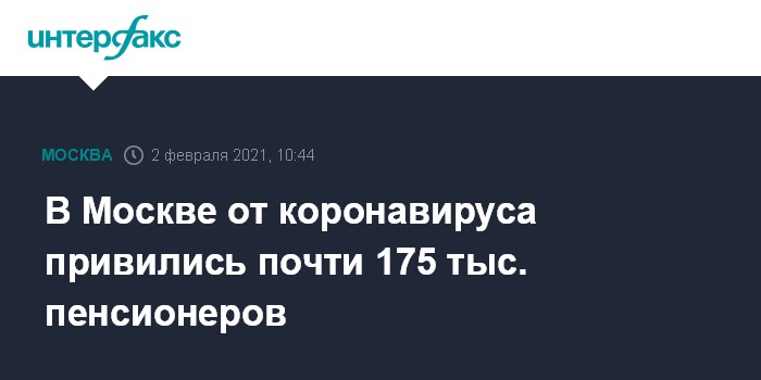 Москва. 2 февраля. INTERFAX.RU - Почти 175 тысяч горожан старше 60 лет в Москве прошли вакцинацию от коронавируса, сообщила заммэра столицы по вопросам социального развития Анастасия Ракова.