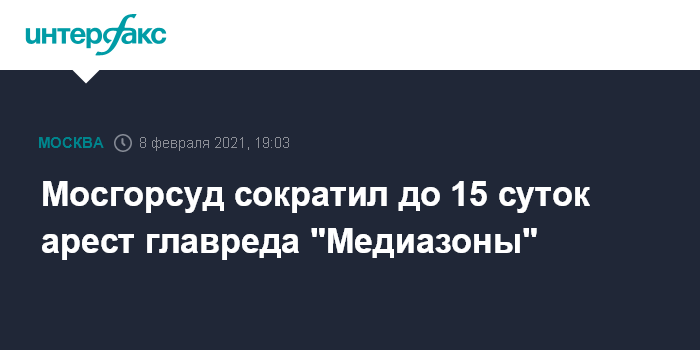 Москва. 8 февраля. INTERFAX.RU - Мосгорсуд сократил с 25 суток до 15 суток административный арест, назначенный главному редактору издания "Медиазона" Сергею Смирнову за повторное нарушение правил проведения публичного мероприятия.