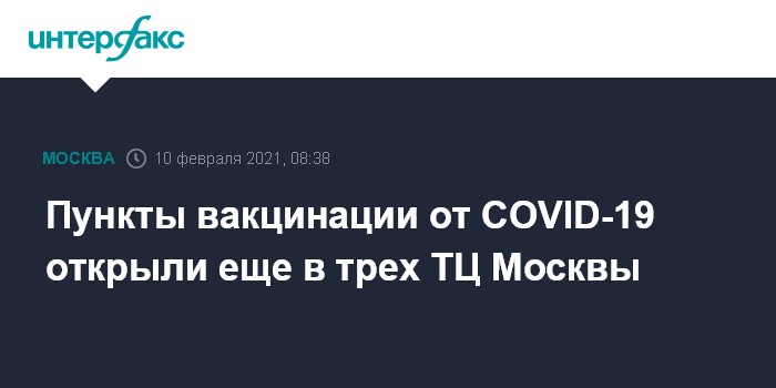 Москва. 10 февраля. INTERFAX.RU - В Москве со среды открылись выездные пункты вакцинации от коронавируса в торговых центрах "Калужский", "Щелковский" и "Водный", объявила заммэра города Анастасия Ракова. Привиться там можно бесплатно, без предварительной записи, при себе нужно иметь паспорт и полис ОМС.