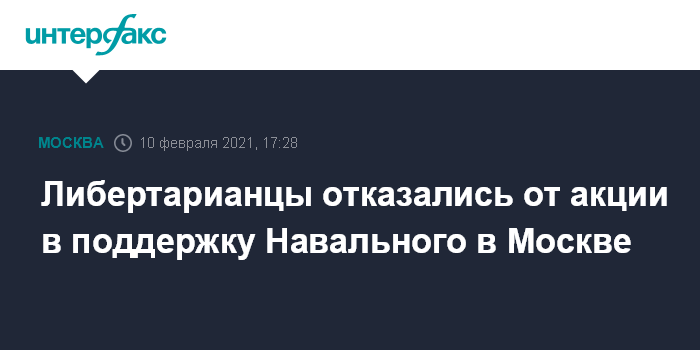 Ранее Либертарианская партия России сообщила, что ее представители подали уведомление в мэрию Москвы на проведение 23 февраля митинга в поддержку Навального.
