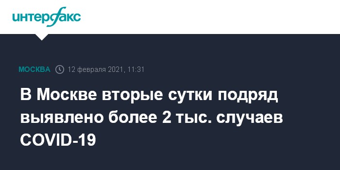 Москва. 12 февраля. INTERFAX.RU - Небольшой рост суточного числа заболевших COVID-19 фиксируют в Москве: за последние 24 часа выявлено более 2,1 тыс. случаев коронавирусной инфекции. Это почти на 100 пациентов больше, чем днем ранее.