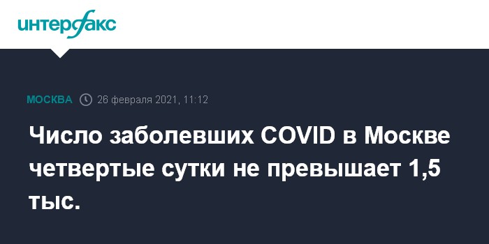 Москва. 26 февраля. INTERFAX.RU - В Москве за последние 24 часа выявили около 1,3 тысячи новых случаев заболевания COVID-19, таким образом четвертые сутки количество новых инфицированных в столице не превышает 1,5 тысячи человек, следует из сообщения оперативного штаба по контролю ситуации с коронавирусом.