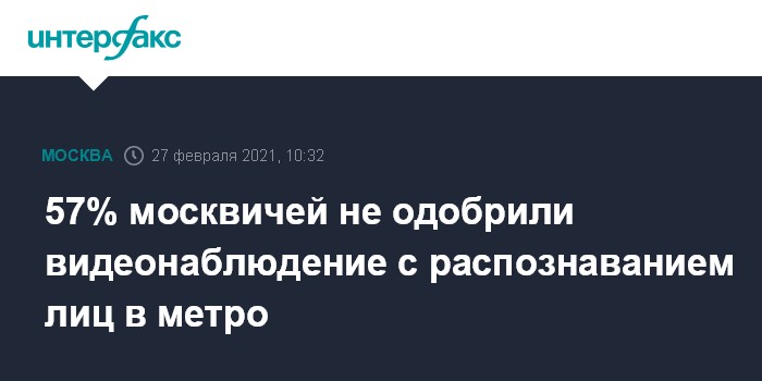 Москва. 27 февраля. INTERFAX.RU - Больше половины жителей Москвы (57%) негативно относятся к установке в столичном метрополитене системы видеонаблюдения, обладающей функцией распознавания лиц, свидетельствуют результаты опроса Исследовательского центра портала SuperJob.ru.
