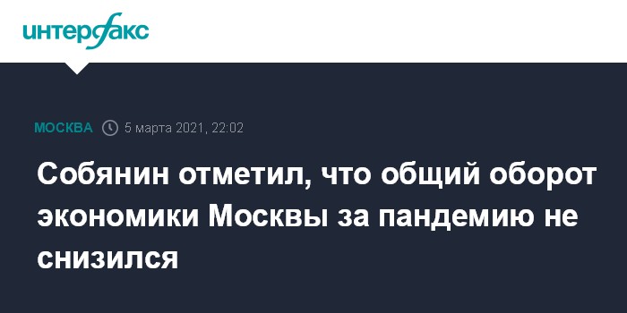 Москва. 5 марта. INTERFAX.RU - Московская экономика переживает пандемию лучше большинства городов Европы, общий оборот не снизился, сообщил мэр Москвы Сергей Собянин.