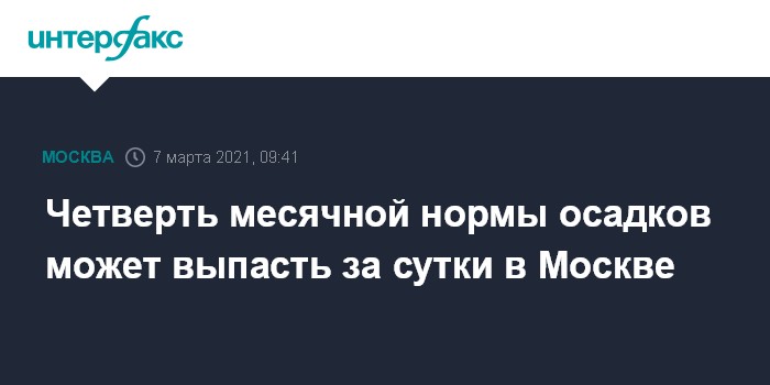 Москва. 7 марта. INTERFAX.RU - По прогнозам синоптиков, в воскресенье в столице может выпасть сразу четверть месячной нормы осадков, сообщила пресс-служба комплекса городского хозяйства в телеграм-канале.