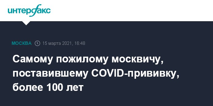 Москва. 15 марта. INTERFAX.RU - Возраст самого пожилого москвича, который получил прививку от COVID-19, - 104 года, он перенес ее хорошо, сообщил главный внештатный специалист по первичной медико-санитарной помощи взрослому населению департамента здравоохранения столицы Андрей Тяжельников.