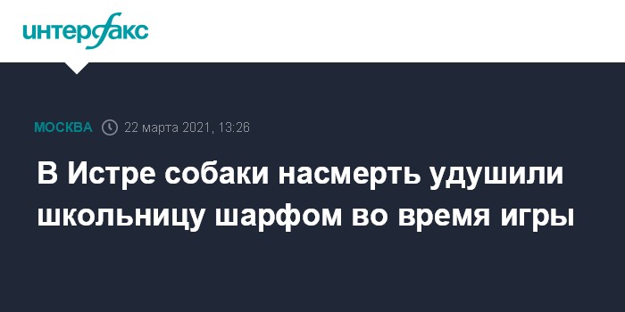 Москва. 22 марта. INTERFAX.RU - В Истре породистые собаки насмерть задушили 11-летнюю девочку во время прогулки, заигравшись ее шарфом, сообщил "Интерфаксу" источник в правоохранительных органах.