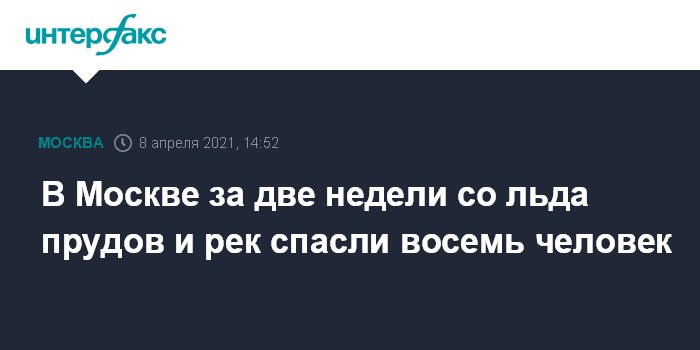 Москва. 8 апреля. INTERFAX.RU - В Москве с 25 марта по 8 апреля на водоемах спасли восемь человек: пятеро из них провалились под лед, троих пришлось снимать с отколовшихся льдин, сообщил телеграм-канал комплекса городского хозяйства.