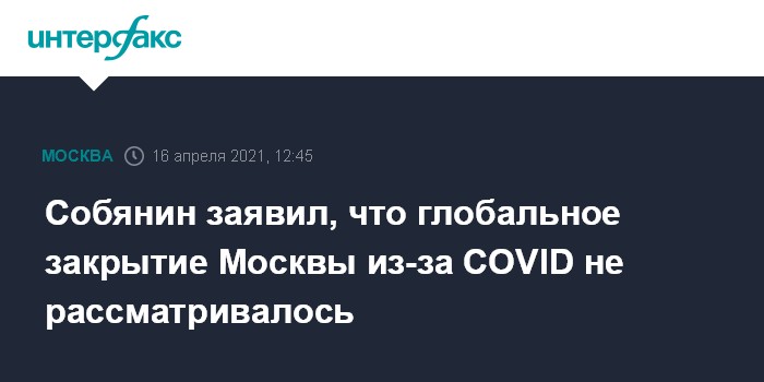 Москва. 16 апреля. INTERFAX.RU - Власти Москвы с самого начала пандемии приняли решение о недопущении глобального закрытия столицы из-за распространения коронавируса, сообщил в пятницу мэр столицы Сергей Собянин в ходе итогового заседания коллегии Минздрава РФ.