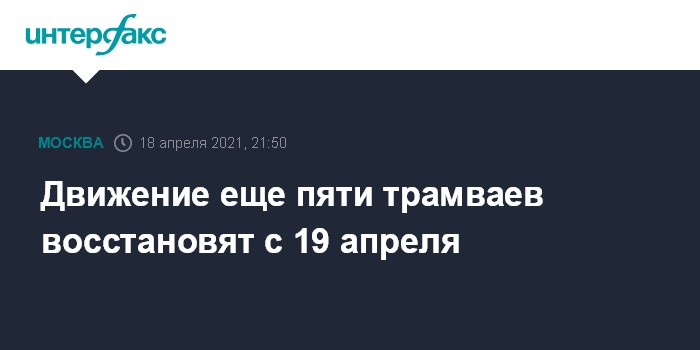 Москва. 18 апреля. INTERFAX.RU - Движение по пяти трамвайным маршрутам восстановят в Богородском районе столицы с 19 апреля, сообщает департамент транспорта Москвы в своем телеграм-канале в воскресенье.