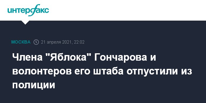 Москва. 21 апреля. INTERFAX.RU - Члена федерального бюро партии "Яблоко" Кирилла Гончарова и 16 волонтеров его избирательного штаба, которые ранее были задержаны в Москве, отпустили из отдела полиции после составления протоколов об административном правонарушении.