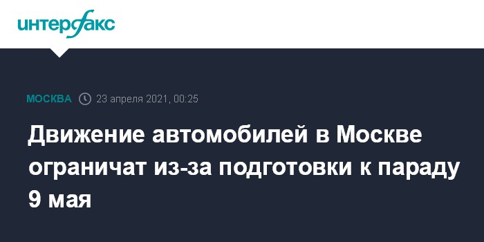 Москва. 23 апреля. INTERFAX.RU - С 23 апреля по 9 мая в Москве ограничат движение из-за подготовки к параду, посвященному 76-й годовщине победы в Великой Отечественной войне, сообщили в департаменте транспорта и развития дорожно-транспортной инфраструктуры столицы.