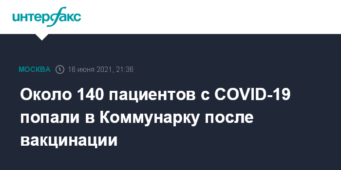 Москва. 16 июня. INTERFAX.RU - Больница в Коммунарке приняла за все время приема пациентов с COVID-19 около 140 больных после вакцинации против коронавируса, сообщил главный врач ГКБ 40 (больница в Коммунарке) Денис Проценко.