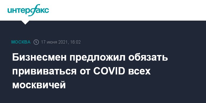 Москва. 17 июня. INTERFAX.RU - В Москве необходимы более серьезные меры по вакцинации жителей города, нужно обязать прививаться от коронавируса всех москвичей, считает генеральный директор ООО "Zaмания", член столичного совета предпринимателей Павел Ковшаров.