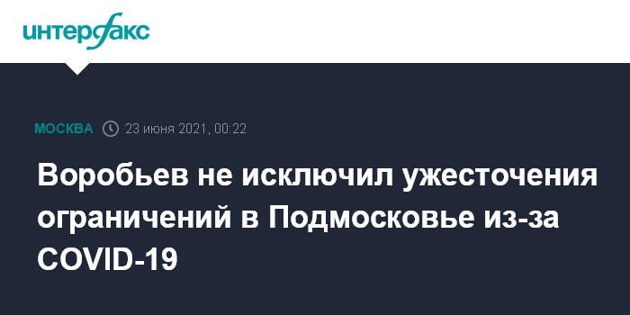 Москва. 23 июня. INTERFAX.RU - Губернатор Подмосковья Андрей Воробьев не исключает ужесточения ограничительных мер в регионе на фоне распространения новой коронавирусной инфекции, сообщает пресс-служба губернатора и правительства области.