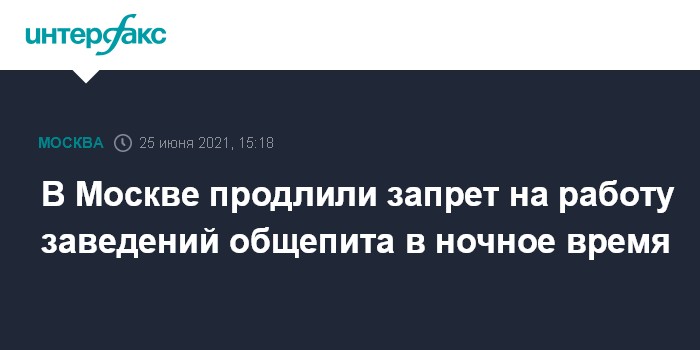 "Продлевается приостановление в период с 23:00 до 6:00 оказания гражданам услуг общественного питания (за исключением продажи товаров, обслуживания на вынос без посещения гражданами помещений предприятий, доставки заказов и оказания бытовых услуг), а также проведения зрелищно-развлекательных мероприятий в ночных клубах, барах, на дискотеках, в караоке", - говорится в указе Собянина, опубликованном в пятницу.