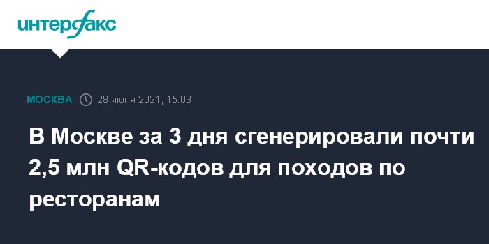 Москва. 28 июня. INTERFAX.RU - В российской столице за три дня сгенерировано почти 2,5 млн QR-кодов для посещения ресторанов и мероприятий, сообщает оперштаб Москвы по контролю распространения коронавируса.