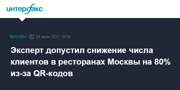 С 28 июня заведения общепита в Москве, согласно указу мэра столицы Сергея Собянина, должны перейти на систему работы по QR-кодам, которые выдаются тем, кто перенес COVID-19, прошел вакцинацию или имеет отрицательный результат теста на коронавирус. Рестораны и кафе обязаны создать систему проверки наличия QR-кодов. Те заведения, которые не выполнят эти требования, смогут работать только навынос или доставку.