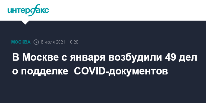 Москва. 6 июля. INTERFAX.RU - Московские полицейские с начала года возбудили 49 уголовных дел по фактам создания и распространения поддельных сертификатов вакцинации от коронавируса, справок об отрицательных результатах ПЦР-тестов, о выявлении антител к вирусу или о медицинских противопоказаниях к вакцинации.