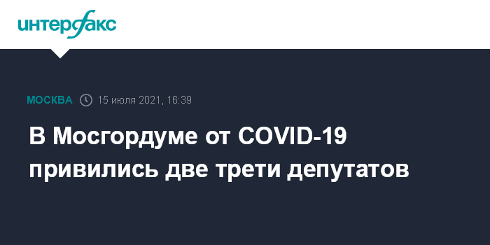 Москва. 15 июля. INTERFAX.RU - В Мосгордуме к 15 июля прививку от коронавируса получили - или находились в процессе вакцинации - 68% депутатов и 65% сотрудников думского аппарата, сообщил спикер этого собрания Алексей Шапошников.