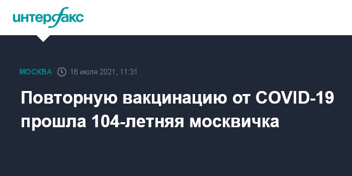 Москва. 16 июля. INTERFAX.RU - Ревакцинацию от коронавируса в столице прошла 104-летняя жительница дома престарелых, она чувствует себя хорошо, сообщил "Интерфаксу" руководитель департамента труда и соцзащиты населения города Москвы Евгений Стружак.