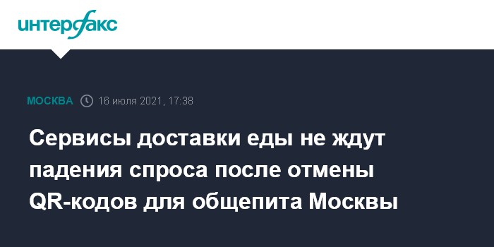 Москва. 16 июля. INTERFAX.RU - Сервисы доставки еды не ожидают снижения числа заказов в связи с отменой с 19 июля системы QR-кодов для посещения кафе и ресторанов в Москве, сообщили "Интерфаксу" в пресс-службах Delivery Club и "Яндекс.Еды".