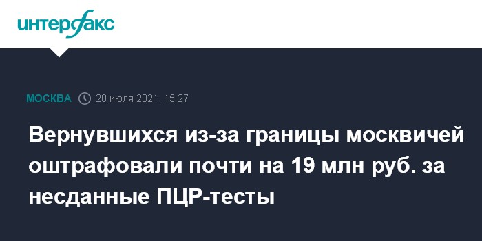 Вернувшихся из-за границы москвичей оштрафовали почти на 19 млн руб. за несданные ПЦР-тесты