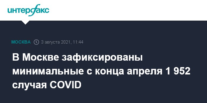 Москва. 3 августа. INTERFAX.RU - В Москве за сутки зафиксировали 1 952 случая заболевания коронавирусом - это минимум с конца апреля, следует из данных оперативного штаба по контролю ситуации с COVID-19.
