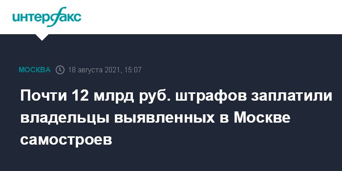 Москва. 18 августа. INTERFAX.RU - За десять лет оштрафованные владельцы самостроев заплатили 12 млрд рублей, сообщили в пресс-службе мэра и правительства столицы.