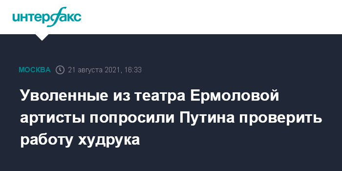 Москва. 21 августа. INTERFAX.RU - Артисты, уволенные из московского театра имени М.Н. Ермоловой, обратились к президенту России Владимиру Путину с просьбой провести проверку деятельности худрука театра Олега Меньшикова и законности сокращения штата.