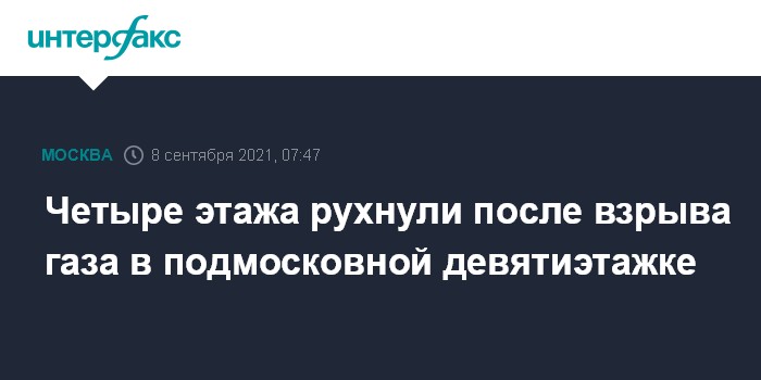 Москва. 8 сентября. INTERFAX.RU - Несколько этажей обрушились при взрыве газа в девятиэтажке в Подмосковье, сообщил "Интерфаксу" информированный источник.