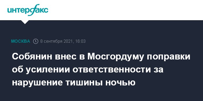 Москва. 8 сентября. INTERFAX.RU - Пакет поправок в столичное и федеральное законодательство об усилении ответственности для водителей за нарушение тишины и покоя ночью внесен в Мосгордуму, сообщил мэр столицы Сергей Собянин в своем блоге в среду.