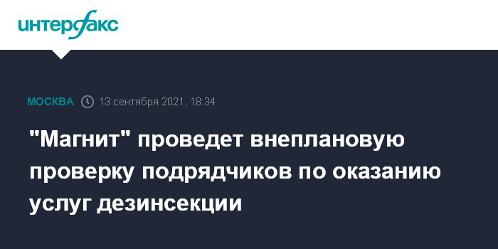 Москва. 13 сентября. INTERFAX.RU - Ритейлер "Магнит" инициирует внеплановую проверку всех своих подрядчиков по оказанию услуг дезинсекции и санитарной обработки и усилит меры санитарного контроля в магазинах, сообщила компания.