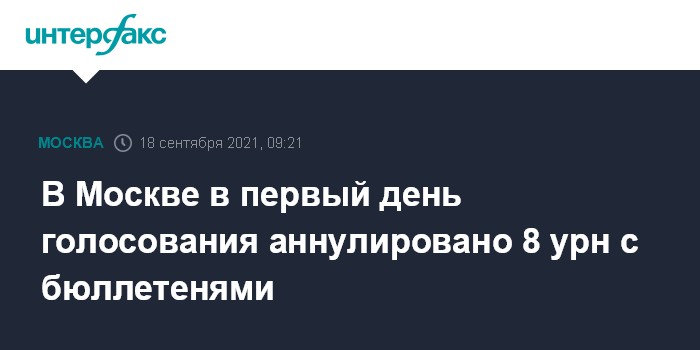 Москва. 18 сентября. INTERFAX.RU - В Москве по итогам первого дня голосования на выборах различного уровня аннулировано восемь урн с бюллетенями избирателей.