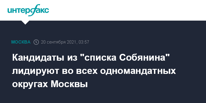 Москва. 20 сентября. INTERFAX.RU - Во всех 15 одномандатных избирательных округах Москвы лидируют кандидаты из так называемого "списка Собянина", следует по результатам обработки в целом по городу 48,3% протоколов и большей части онлайн-голосов, передал корреспондент "Интерфакса".