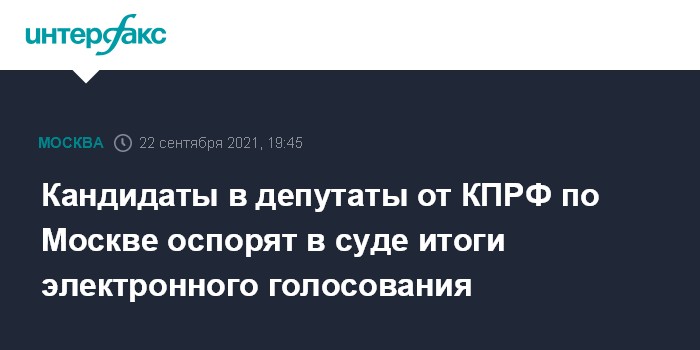 Как уточнил "Интерфаксу" пресс-секретарь фракции КПРФ в Мосгордуме, член предвыборного штаба МГК КПРФ Никита Попов, подача иска в суд на итоги дистанционного электронного голосования в Москве планируется 24 сентября.