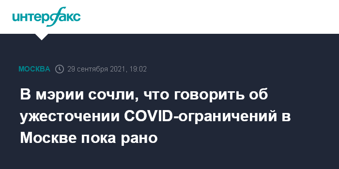 Москва. 29 сентября. INTERFAX.RU - Медицина готова к произошедшему росту заболеваемости COVID-19, о введении дополнительных ограничений говорить рано, сказал руководитель департамента торговли и услуг столицы Алексей Немерюк.