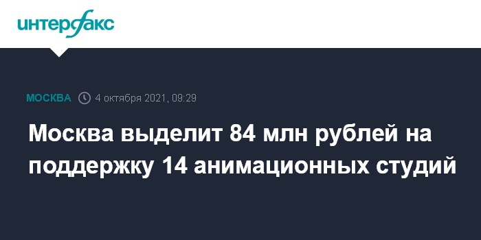 Москва. 4 октября. INTERFAX.RU - Правительство Москвы одобрило выделение около 84 млн рублей грантов 14 анимационным студиям в 2021 году, сообщила через портал горадминистрации заммэра столицы Наталья Сергунина.