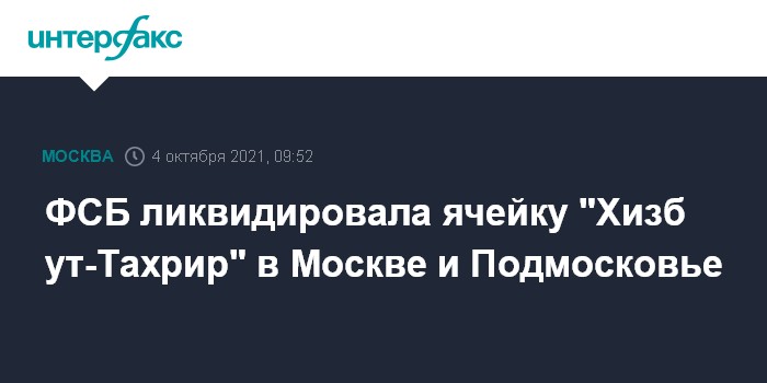 Москва. 4 октября. INTERFAX.RU - ФСБ сообщает о задержании в Москве и Подмосковье двух лидеров и шестерых участников ячейки запрещенной в РФ международной террористической организации "Хизб ут-Тахрир аль-Ислами", занимавшихся распространением радикальной идеологии.