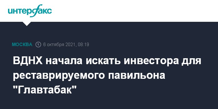 Москва. 6 октября. INTERFAX.RU - ВДНХ ищет инвестора на право долгосрочной аренды павильона №35 "Главтабак", сообщил "Интерфаксу" руководитель пресс-службы выставки Александр Жестков. Сейчас павильон находится на реставрации, которую должны завершить в 2022 году.