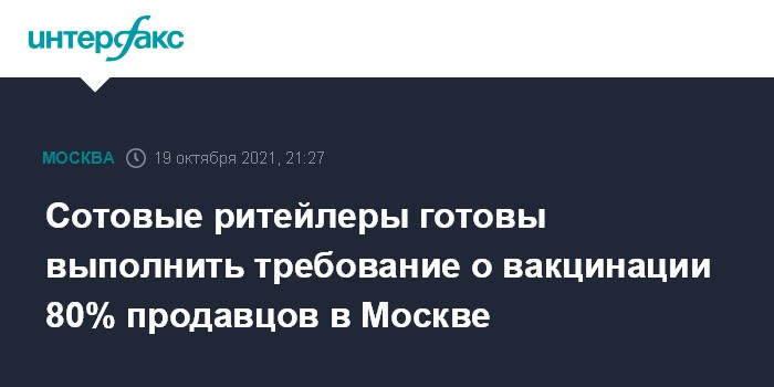Москва. 19 октября. INTERFAX.RU - Владельцы сотовой розницы готовы выполнить требование о вакцинации 80% продавцов в Москве, на сегодняшний день привито большинство из них, рассказали "Интерфаксу" в компаниях.