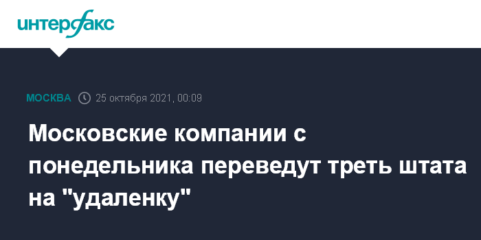 Москва. 25 октября. INTERFAX.RU - Около трети штата московских компаний с понедельника, 25 октября, должна перейти на удаленный формат работы, трудиться из дома придется четыре месяца.