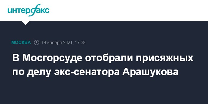 Москва. 19 ноября. INTERFAX.RU - В Мосгорсуде завершился отбор присяжных для рассмотрения уголовного дела бывшего члена Совета Федерации от Карачаево-Черкессии Рауфа Арашукова и его отца, обвиняемых, в зависимости от роли каждого, в убийствах и организации преступного сообщества, сообщила "Интерфаксу" адвокат бывшего сенатора Анна Ставицкая.