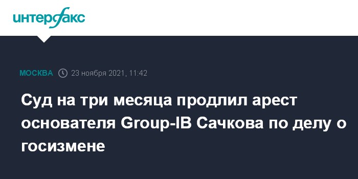 Москва. 23 ноября. INTERFAX.RU - Лефортовский суд Москвы по ходатайству следствия продлил арест обвиняемого в госизмене Ильи Сачкова - основателя российской компании Group-IB, занимающейся кибербезопасностью, сообщили "Интерфаксу" в пресс-службе суда.