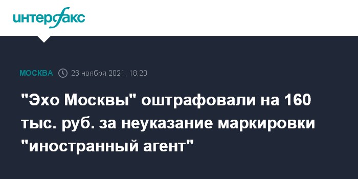 Москва. 26 ноября. INTERFAX.RU - Пресненский суд Москвы назначил штраф в размере 160 тыс. рублей "Эхо Москвы" за публикацию на сайте радиостанции сведений о признанных иностранным агентом организациях без соответствующей маркировки.